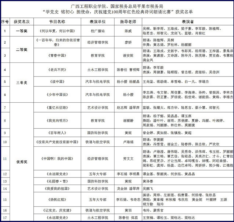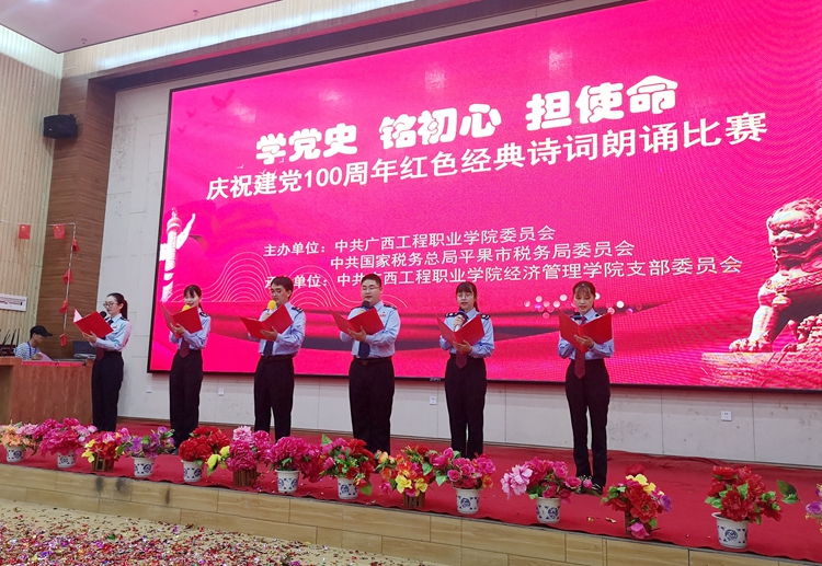 為慶祝中國共產(chǎn)黨成立100周年,傳承紅色基因,賡續(xù)共產(chǎn)黨人精神血脈,進(jìn)一步激發(fā)大學(xué)生的愛黨愛國愛社會主義情懷。6月29日晚,由中共廣西工程職業(yè)學(xué)院委員會、中共國家稅務(wù)總局平果市稅務(wù)局委員會聯(lián)合主辦,中共廣西工程職業(yè)學(xué)院經(jīng)濟(jì)管理學(xué)院支部委員會承辦的“學(xué)黨史、銘初心、擔(dān)使命,慶祝建黨100周年紅色經(jīng)典詩詞朗誦比賽”在學(xué)校圖文信息大樓報(bào)告廳舉行。