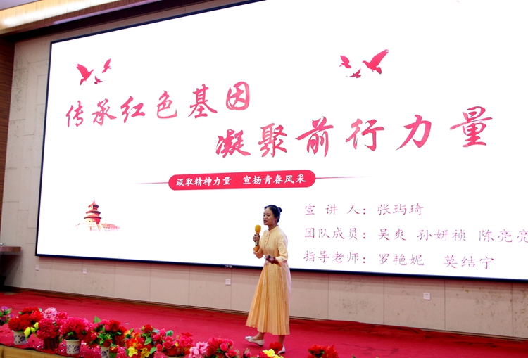 比賽現(xiàn)場還穿插了一個(gè)特殊環(huán)節(jié)。6月24日,我校參加廣西高校思政課共建第六組“學(xué)‘四史’守初心,揚(yáng)青春擔(dān)使命”大學(xué)生理論宣講比賽并榮獲特等獎(jiǎng)1項(xiàng)、一等獎(jiǎng)2項(xiàng)。榮獲特等獎(jiǎng)的張嶼琦團(tuán)隊(duì)現(xiàn)場在今天給大家講一堂精彩的《傳承紅色基因,凝聚前行力量》黨史學(xué)習(xí)課。