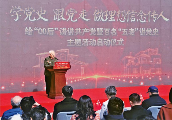 2021年2月23日,“學(xué)黨史 跟黨走 做理想信念傳人——給‘00后’講講共產(chǎn)黨暨百名‘五老’講黨史主題活動(dòng)”在位于上海市嘉定區(qū)的外岡游擊隊(duì)紀(jì)念館正式啟動(dòng)。本次活動(dòng)拉開了上海教育系統(tǒng)黨史學(xué)習(xí)教育的序幕,將組織包括新四軍老戰(zhàn)士在內(nèi)的一批老干部、老戰(zhàn)士、老專家、老教師、老模范走進(jìn)校園,以“校外輔導(dǎo)員”的方式,參與大學(xué)和中小學(xué)的思想政治教育,教育引導(dǎo)青少年始終聽黨的話、永遠(yuǎn)跟黨走。圖為上海市新四軍歷史研究會(huì)名譽(yù)會(huì)長、九旬新四軍老戰(zhàn)士阮武昌在活動(dòng)現(xiàn)場講述新四軍的抗日故事。 新華社記者 劉穎/攝