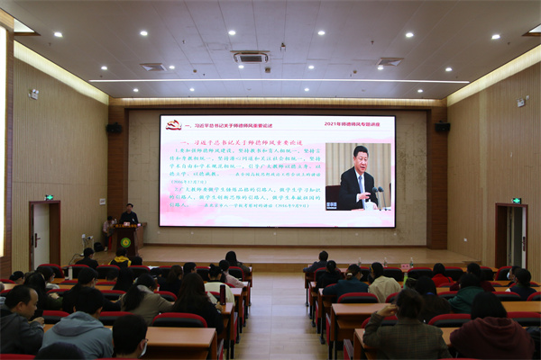 呂書(shū)記結(jié)合自己的教育教學(xué)實(shí)踐,重點(diǎn)圍繞習(xí)近平總書(shū)記關(guān)于師德師風(fēng)重要論述、國(guó)家有關(guān)師德師風(fēng)文件精神、新時(shí)代高校教師職業(yè)行為十項(xiàng)準(zhǔn)則、教育部公開(kāi)曝光違反教師職業(yè)行為十項(xiàng)準(zhǔn)則典型案例、努力成為黨和人民滿意的新時(shí)代“四有”好教師等五個(gè)方面,深入淺出詮釋了良好的師德師風(fēng)的主要內(nèi)涵。呂書(shū)記強(qiáng)調(diào),廣大教師要珍惜人民教師無(wú)上光榮這份光榮,愛(ài)惜這份職業(yè),嚴(yán)格要求自己,不斷完善自己。要以德立身、以德立學(xué)、以德施教,自覺(jué)肩負(fù)起塑造靈魂、塑造生命、塑造新人的時(shí)代重任。呂書(shū)記希望廣大教師要按照習(xí)近平總書(shū)記的要求,緊緊圍繞“立德樹(shù)人”的根本任務(wù),著力解決好“培養(yǎng)什么人、怎樣培養(yǎng)人、為誰(shuí)培養(yǎng)人”這一根本問(wèn)題,堅(jiān)定理想信念,忠誠(chéng)黨的教育事業(yè),淡泊名利,努力爭(zhēng)做有理想信念、有道德情操、有扎實(shí)學(xué)識(shí)、有仁愛(ài)之心的黨和人民滿意的新時(shí)代“四有”好老師。