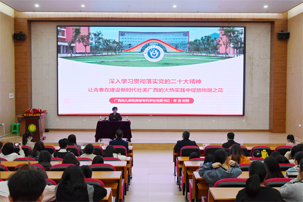 2023年2月27日,黨的二十大精神廣西高校宣講團(tuán)成員,廣西幼兒師范高等??茖W(xué)校黨委書記曹迎到我校宣講黨的二十大精神,學(xué)校領(lǐng)導(dǎo)干部及教職工、學(xué)生代表共350人一同聆聽宣講報(bào)告。宣講報(bào)告會(huì)在學(xué)校圖文信息大樓一樓學(xué)術(shù)報(bào)告廳進(jìn)行,由學(xué)校黨委書記蒙本曼主持。