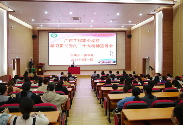 3月14日,學(xué)校在圖文信息大樓一樓學(xué)術(shù)報告廳舉行學(xué)習(xí)宣傳貫徹黨的二十大精神宣講報告會,學(xué)校黨委書記、督導(dǎo)專員蒙本曼作宣講報告。學(xué)校黨委副書記黃秋霞,紀委書記、副校長彭高彬,副校長吳先夏等學(xué)校領(lǐng)導(dǎo)出席宣講報告會,各黨(總)支部書記、各處室負責(zé)人、科級干部、黨員教師、輔導(dǎo)員、教師代表等400多人參加報告會。