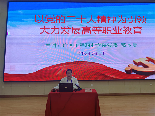 報告會上,蒙本曼總結(jié)了我國高等職業(yè)教育在40多年的發(fā)展歷程中經(jīng)歷的許多大事、完成的重要任務(wù),以及取得的一系列標(biāo)志性成果。他特別指出,進入新世紀后,在國家實施高等教育大眾化和加快發(fā)展職業(yè)教育的雙重政策推動下,持續(xù)出臺的“示范計劃”“雙高計劃”等高瞻遠矚的政策措施推動了高職教育實現(xiàn)了歷史性的發(fā)展,取得歷史性的成就。他強調(diào),職業(yè)教育是黨和政府高度重視和始終關(guān)心的一項民生事業(yè),在習(xí)近平總書記的系列重要講話和黨的二十大報告中,對進一步強化職業(yè)教育的表述鮮明而具體,如“統(tǒng)籌職業(yè)教育、高等教育、繼續(xù)教育協(xié)同創(chuàng)新,推進職普融通、產(chǎn)教融合、科教融匯、優(yōu)化職業(yè)教育類型定位”等,都為未來職業(yè)教育的發(fā)展提供了重要指引,也增強了師生對職業(yè)教育發(fā)展前景的信心。蒙本曼要求,全校黨員干部教師要以自信、團結(jié)、努力的精神風(fēng)貌,全力書寫建設(shè)壯美廣西和社會主義現(xiàn)代化國家新征程的職業(yè)教育新篇章。