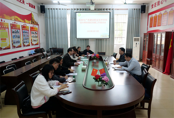 2023年3月15日下午,廣西建設(shè)職業(yè)技術(shù)學(xué)院黨委副書記曾繁雄一行到我校開展結(jié)對幫扶高校黨建交流活動,我校黨委書記蒙本曼出席結(jié)對幫扶高校黨建交流活動,各黨(總)支部書記參加兩校黨建工作經(jīng)驗交流座談會。