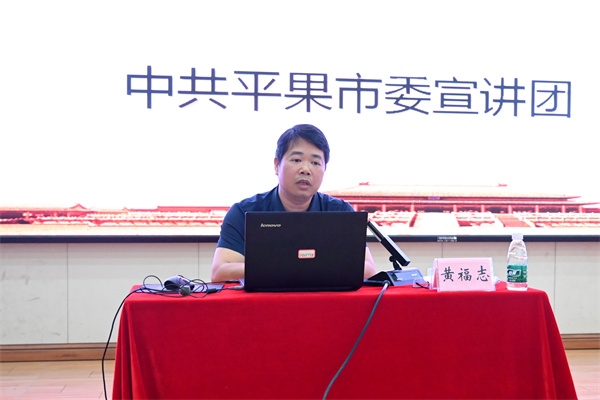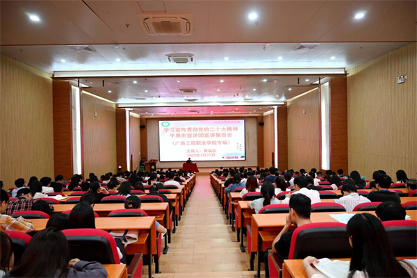 3月21日下午,在學(xué)校圖文信息大樓一樓學(xué)術(shù)報(bào)告廳,平果市宣講團(tuán)成員黃福志主任為學(xué)校黨員干部教師作學(xué)習(xí)宣傳貫徹黨的二十大精神宣講報(bào)告。學(xué)校黨委副書(shū)記黃秋霞、校長(zhǎng)助理梁善雅等校級(jí)領(lǐng)導(dǎo)出席報(bào)告會(huì),各部門(mén)負(fù)責(zé)人、黨支部書(shū)記、科長(zhǎng)、行政人員、教師代表等400多人參加報(bào)告會(huì)。報(bào)告會(huì)由黃秋霞副書(shū)記主持。