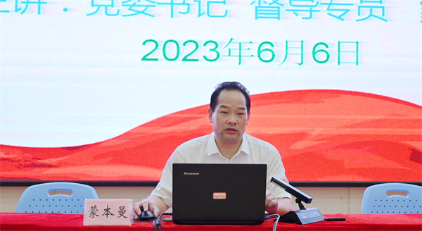 為進(jìn)一步學(xué)習(xí)宣傳貫徹習(xí)近平新時(shí)代中國(guó)特色社會(huì)主義思想,引導(dǎo)全校黨員干部不斷加強(qiáng)思想政治理論學(xué)習(xí),推進(jìn)學(xué)習(xí)貫徹習(xí)近平新時(shí)代中國(guó)特色社會(huì)主義思想主題教育在全校落深落實(shí)。6月6日19:30分,我校黨委在圖文信息樓一樓學(xué)術(shù)報(bào)告廳舉行學(xué)習(xí)貫徹習(xí)近平新時(shí)代中國(guó)特色社會(huì)主義思想主題教育專題培訓(xùn)會(huì),學(xué)校黨委書(shū)記、督導(dǎo)專員蒙本曼,黨委副書(shū)記黃秋霞,紀(jì)委書(shū)記、副校長(zhǎng)彭高彬,副校長(zhǎng)蔣茂麗,以及各黨委委員、二級(jí)學(xué)院黨組織書(shū)記和全體黨員干部參加培訓(xùn)會(huì),會(huì)議由黨委副書(shū)記黃秋霞主持,黨委書(shū)記、督導(dǎo)專員蒙本曼進(jìn)行授課培訓(xùn)。
