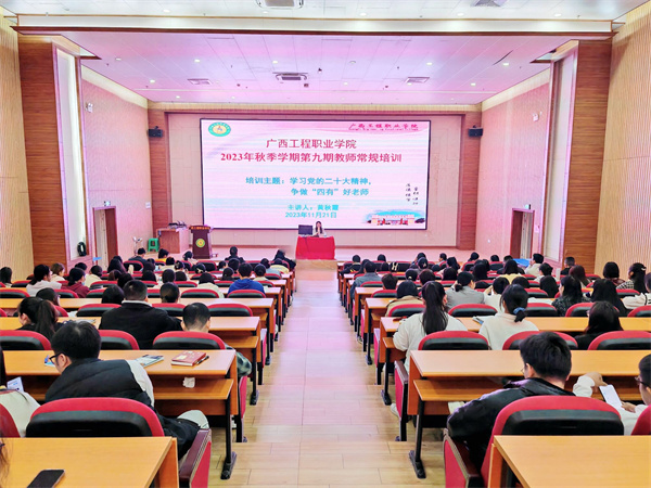 偉大的教育家雅斯貝爾斯曾說:“教育的本質(zhì)是一棵樹搖動(dòng)另一棵樹,一朵云推動(dòng)另一朵云,一個(gè)靈魂喚醒另一個(gè)靈魂。”為深入學(xué)習(xí)宣傳貫徹黨的二十大精神,加強(qiáng)學(xué)校師德師風(fēng)建設(shè),打造高素質(zhì)教師團(tuán)隊(duì),引導(dǎo)廣大教師做“有理想信念、有道德情操、有扎實(shí)學(xué)識(shí)、有仁愛之心”的“四有”好老師,2023年11月21日,廣西工程職業(yè)學(xué)院舉行2023年秋季學(xué)期第九期教師常規(guī)培訓(xùn)會(huì),黨委副書記黃秋霞作“學(xué)習(xí)黨的二十大精神,爭(zhēng)做‘四有’好老師”主題培訓(xùn)。全體教師參加了培訓(xùn)會(huì)。