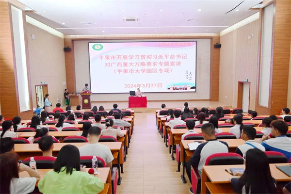 3月27日,平果市學(xué)習(xí)貫徹習(xí)近平總書記對廣西重大方略要求專題宣講(平果市大學(xué)園區(qū)專場)在廣西工程職業(yè)學(xué)院圖文信息大樓報告廳舉行,平果市大學(xué)園區(qū)管理服務(wù)中心組織園區(qū)干部職工及園區(qū)內(nèi)3所高職院校師生代表300人到場學(xué)習(xí)。