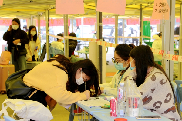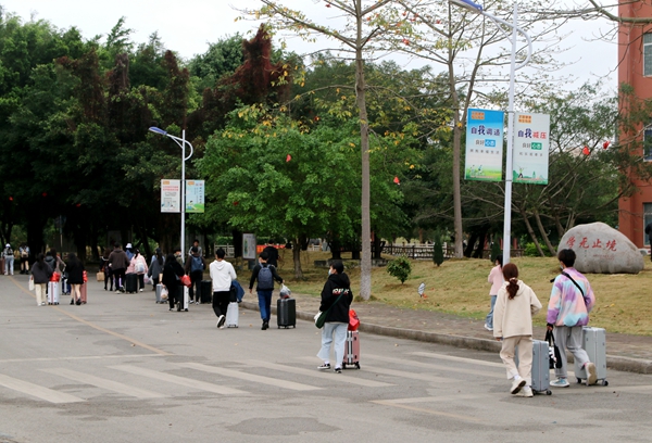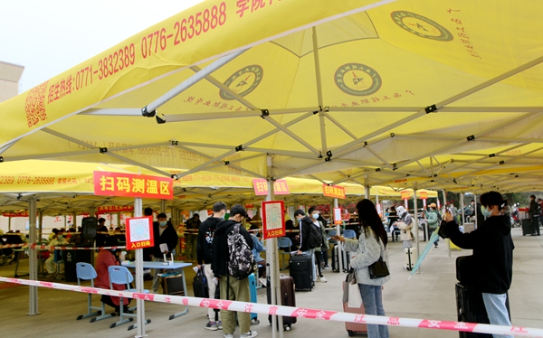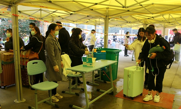 學(xué)生返校當(dāng)天,學(xué)校在校門(mén)口搭建了臨時(shí)帳篷,劃分了“汽車(chē)停放區(qū)”“排隊(duì)等候區(qū)”“掃碼區(qū)”“體溫測(cè)量區(qū)”“行李消殺區(qū)”“返校資料審核區(qū)”等多個(gè)區(qū)域,并開(kāi)通了多條通道方便學(xué)生有序返校。學(xué)生配合疫情防控查驗(yàn),有序排隊(duì),進(jìn)行體溫篩查,出示健康“綠碼”,進(jìn)行行李消殺和核驗(yàn)返校材料信息無(wú)誤后,簽到注冊(cè)、上交相關(guān)材料,安全進(jìn)入校園。學(xué)校還貼心安排了觀光車(chē),幫助學(xué)生運(yùn)送行李至宿舍樓。