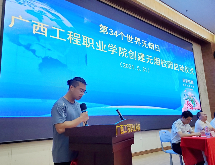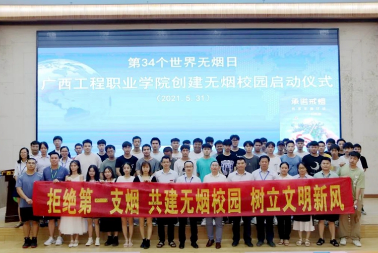 2021年5月31日是第34個(gè)世界無煙日,我校在圖文信息大樓報(bào)告廳舉行廣西工程職業(yè)學(xué)院創(chuàng)建無煙校園啟動(dòng)儀式。學(xué)校黨委委員、副校長(zhǎng)、宣傳部部長(zhǎng)彭高彬,副校長(zhǎng)吳先夏,學(xué)生工作處副處長(zhǎng)吳發(fā)德,保衛(wèi)處副處長(zhǎng)盧保日,后勤管理中心副處長(zhǎng)劉兆兵,以及團(tuán)委、各二級(jí)學(xué)院負(fù)責(zé)人出席儀式。各二級(jí)學(xué)院學(xué)生代表約300人參加啟動(dòng)儀式。啟動(dòng)儀式由汽車與機(jī)電學(xué)院學(xué)生白一凡主持。