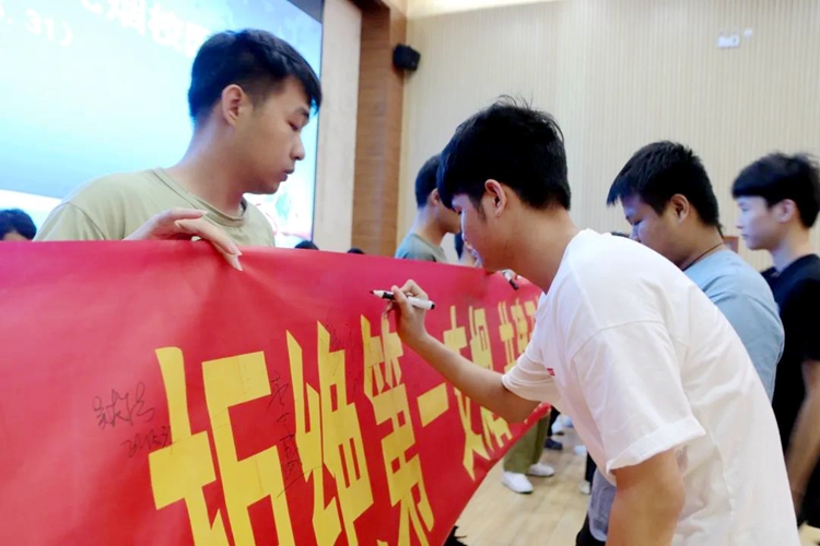 參加儀式的領(lǐng)導(dǎo)、老師及學(xué)生代表紛紛上臺(tái),在“拒絕第一支煙,共建文明校園”橫幅上簽字。