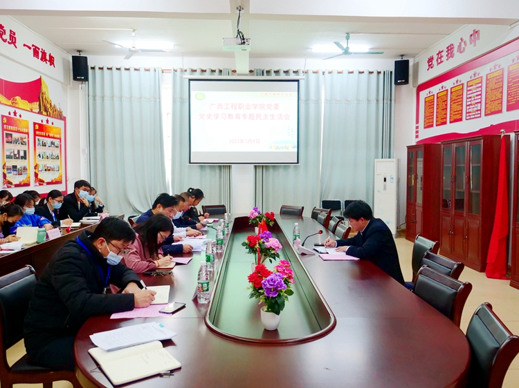 根據百色市紀委機關、組織部、黨史學習教育領導小組統(tǒng)一部署和百色市教育工委要求,2022年3月9日上午,我校在圖書館一樓黨員活動室召開2021年度黨員領導干部黨史學習教育專題民主生活會。百色市委教育工委黨史學習教育指導組李飛勇同志蒞臨會議全程指導。學校黨委書記呂偉斌,黨委委員、董事長李益,黨委副書記黃秋霞,紀委書記、副校長彭高彬以及黨委領導班子其他成員參加會議,黨委辦公室、各黨支部書記及支委等列席會議。會議由黨委書記呂偉斌主持。