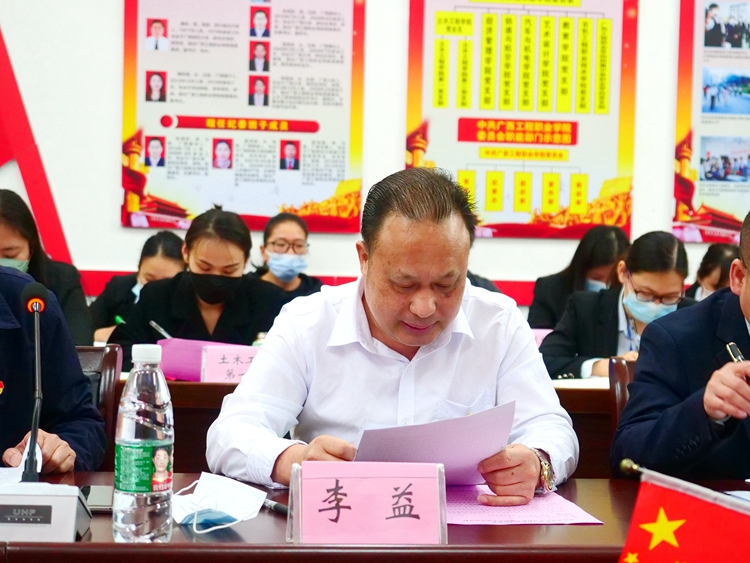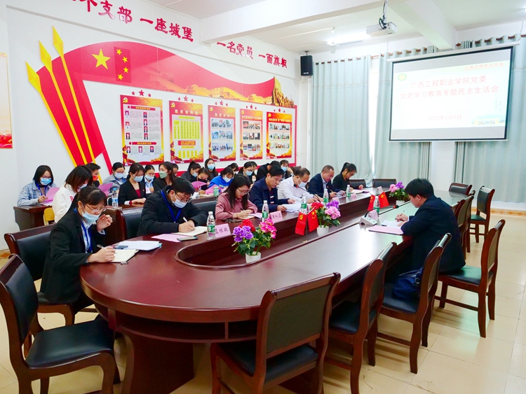 呂書記強調指出,班子成員要帶頭進一步提高政治站位,全面學習貫徹習近平新時代中國特色社會主義思想,抓好常態(tài)化黨史學習教育,深刻感悟“兩個確立”的決定性意義,深刻感悟黨堅持把馬克思主義同中國具體實際相結合、同中華優(yōu)秀傳統(tǒng)文化相結合的非凡歷程,牢固樹立正確的黨史觀。要堅持用習近平新時代中國特色社會主義思想武裝頭腦、指導實踐、推動工作,帶頭真學、真信、真懂、真用,帶頭牢記我們黨是什么、要干什么這個根本問題,心懷 “國之大者”,不斷增強“四個意識”,堅定“四個自信”,做到“兩個維護”。要堅持貫徹新發(fā)展理念,履職盡責、擔當作為,聚焦新冠肺炎疫情防控、保持經濟發(fā)展、深化改革開放、維護社會穩(wěn)定等正在做的工作,不折不扣把黨中央決策部署落實到位;帶頭踐行以人民為中心的發(fā)展思想,尊重群眾意愿,為群眾辦實事解難題,有效保障改善民生,增強人民群眾獲得感幸福感安全感,確保黨永遠保持同人民群眾的血肉聯(lián)系;要堅定扛起管黨治黨的政治責任,帶頭深刻汲取黨史中正反兩方面經驗,履行全面從嚴治黨責任,旗幟鮮明講政治,嚴守黨的政治紀律和政治規(guī)矩,落實中央八項規(guī)定及其實施細則精神,持續(xù)用力糾“四風”、樹新風。要深入學習貫徹習近平總書記關于教育的重要論述,特別是對發(fā)展職業(yè)教育的重要批示精神,以及視察廣西“4·27”重要講話精神和對廣西工作的系列重要指示精神,推進黨建工作與業(yè)務工作深度融合,勇于擔當、攻堅克難,統(tǒng)籌抓好新冠肺炎疫情防控和學校各項工作,確保中央精神和自治區(qū)黨委、百色市委各項決策部署在學校落地生根,勇毅前行,努力開創(chuàng)新時代廣西工程職業(yè)學院高質量發(fā)展新局面,為建設新時代中國特色社會主義壯美廣西作出新的更大貢獻,以優(yōu)異成績迎接黨的二十大勝利召開。