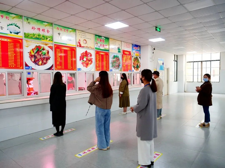 食堂工作人員在中午放學(xué)前在飯?zhí)瞄T(mén)口執(zhí)勤并且組織學(xué)生先洗手,從正門(mén)有序排隊(duì)量體溫,學(xué)生隔開(kāi)入座就餐。就餐時(shí)摘掉舊口罩放至醫(yī)療垃圾桶,餐后清理桌面,并帶上新口罩。