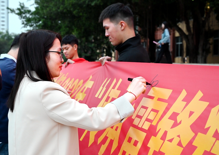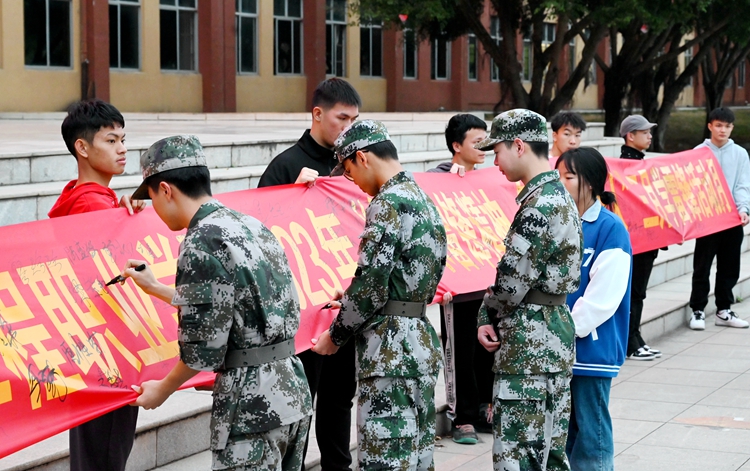 2023年三月學(xué)雷鋒活動啟動后,參加儀式的師生紛紛在活動主題背景墻簽名。