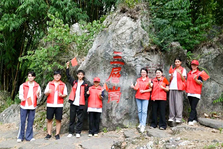 路旁的石頭靜靜佇立,仿佛在訴說革命年代紅軍開拓革命根據(jù)地,進(jìn)行游擊戰(zhàn)的不易。頂著烈日前行,大家大汗淋漓,極目遠(yuǎn)眺,層巒疊嶂,感慨萬千,當(dāng)年的革命之路太不容易了。經(jīng)過近一個小時的“長征”,實(shí)踐隊員終于來到了鐫刻有“三層崗”的大石頭前。