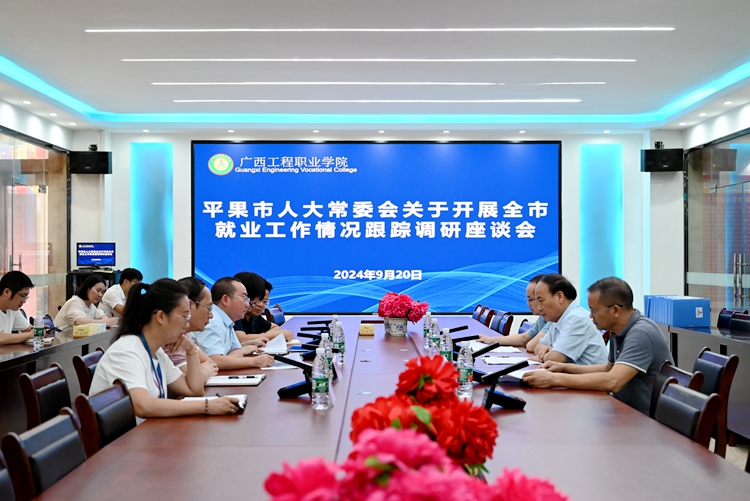 2024年9月20日上午,平果市人大常委會(huì)副主任李俊整一行到廣西工程職業(yè)學(xué)院調(diào)研就業(yè)工作。學(xué)校紀(jì)委書記、副校長彭高彬,副校長黃德偉,教務(wù)處、招生就業(yè)處負(fù)責(zé)人及相關(guān)工作人員參加調(diào)研會(huì)。