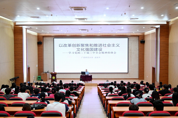 報(bào)告會上,孟憲平教授聚焦黨的二十屆三中全會精神,結(jié)合廣西高校實(shí)際,圍繞“以改革創(chuàng)新聚焦和推進(jìn)社會主義文化強(qiáng)國建設(shè)”這一主題,從深刻領(lǐng)會和把握黨的二十屆三中全會精神、深刻認(rèn)識深化文化體制機(jī)制改革的重大意義、牢牢把握深化文化體制機(jī)制改革的基本要求、文化體制機(jī)制改革的重點(diǎn)內(nèi)容和現(xiàn)實(shí)路徑等四個(gè)方面內(nèi)容,對黨的二十屆三中全會提出的深化文化體制機(jī)制改革的豐富內(nèi)涵、核心要義和實(shí)踐要求進(jìn)行了系統(tǒng)宣講和深入闡述。
