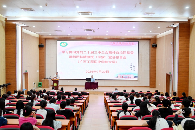 9月30日上午,學(xué)習(xí)貫徹黨的二十屆三中全會精神自治區(qū)黨委講師團(tuán)特聘教授(專家)宣講報(bào)告會在我校圖文信息大樓一樓學(xué)術(shù)報(bào)告廳舉行,自治區(qū)黨委講師團(tuán)特聘教授(專家)、廣西師范大學(xué)馬克思主義學(xué)院孟憲平教授作宣講報(bào)告。
