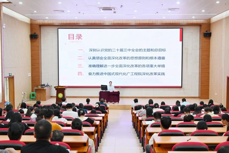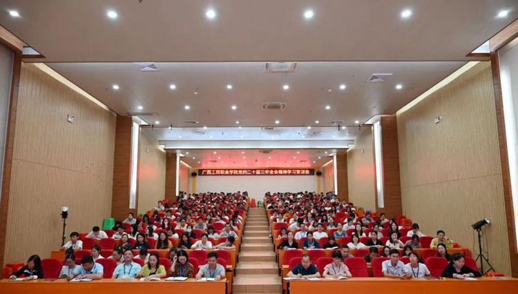 為深入學(xué)習(xí)貫徹黨的二十屆三中全會(huì)精神,10月15日下午,在圖文信息大樓一樓學(xué)術(shù)報(bào)告廳,廣西工程職業(yè)學(xué)院舉行學(xué)習(xí)貫徹黨的二十屆三中全會(huì)精神宣講會(huì)。