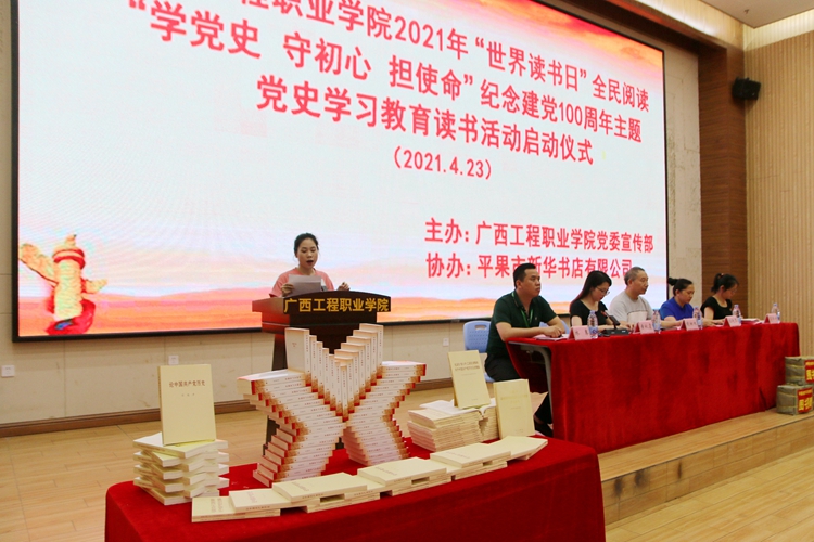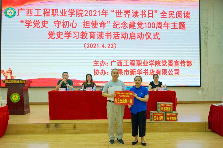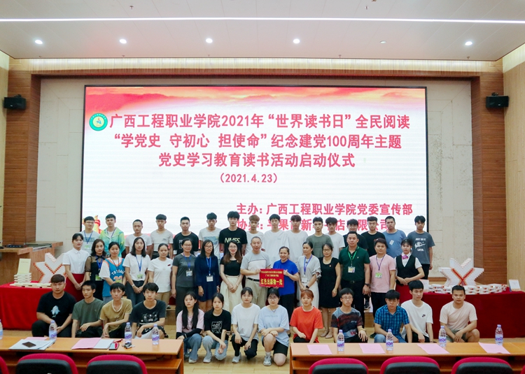 為慶祝中國共產(chǎn)黨成立100周年,創(chuàng)新黨史學(xué)習(xí)教育形式,持續(xù)做好中華優(yōu)秀文化傳承,推動全民閱讀深入大學(xué)校園,在青年學(xué)生中形成“愛讀書、讀好書、善讀書”的風(fēng)尚,營造書香校園氛圍,引導(dǎo)青年學(xué)生傳承紅色基因、牢記初心使命,“學(xué)史明理、學(xué)史增信、學(xué)史崇德、學(xué)史力行”, 4月23日,學(xué)校在圖文信息大樓報(bào)告廳舉行廣西工程職業(yè)學(xué)院2021年“世界讀書日”全民閱讀暨“學(xué)黨史 守初心 擔(dān)使命”紀(jì)念建黨100周年主題黨史學(xué)習(xí)教育讀書活動啟動儀式。