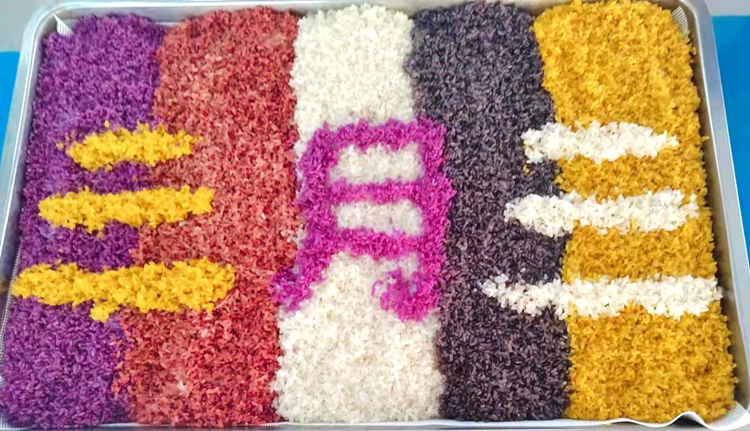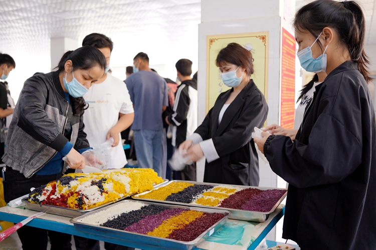 老師為同學(xué)們分發(fā)五色糯米飯