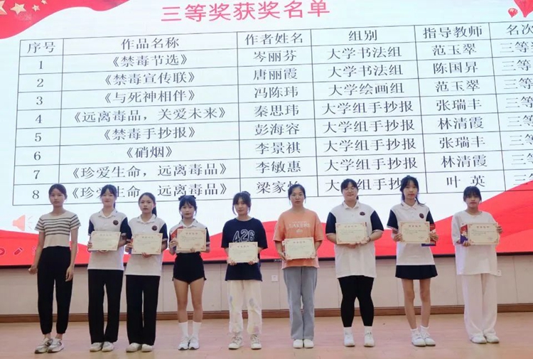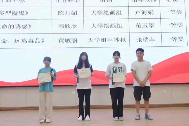 教育學院黨支部書記盧燕梅為獲得“青少年禁毒文藝作品大賽”二等獎的同學頒獎