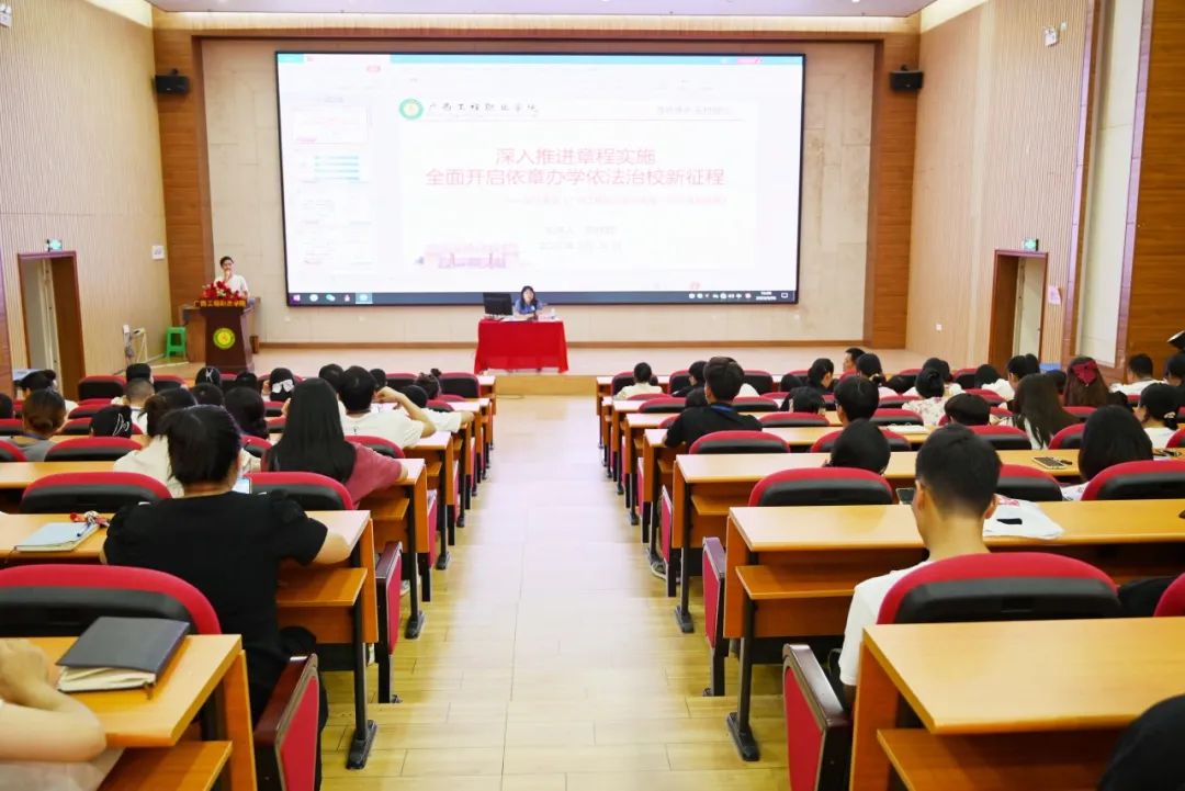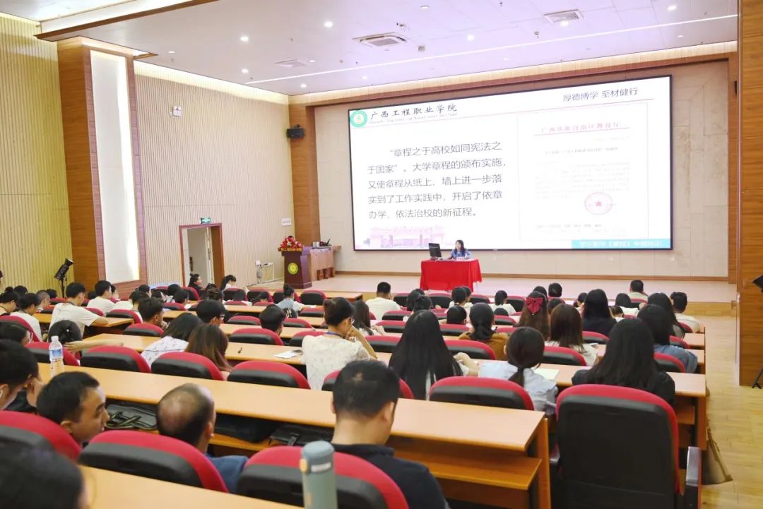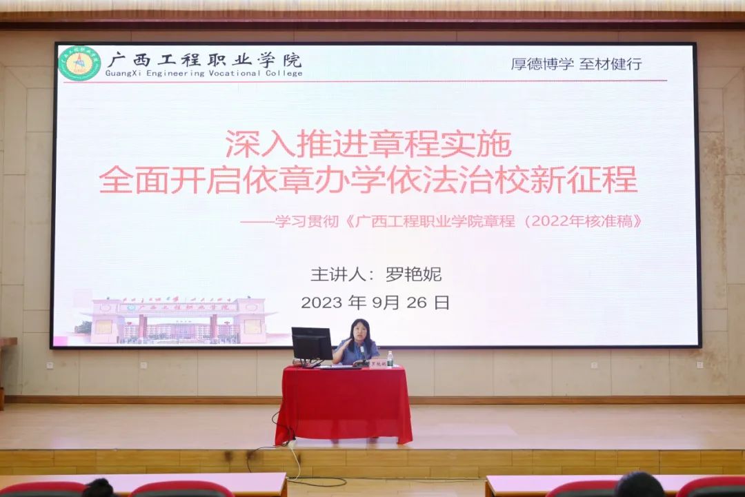 培訓(xùn)中,羅艷妮校長(zhǎng)主要從《廣西工程職業(yè)學(xué)院章程》(以下簡(jiǎn)稱《章程》)的主要內(nèi)容、《章程》核準(zhǔn)后發(fā)揮的積極作用、《章程》實(shí)施與大學(xué)治理現(xiàn)代化的幾點(diǎn)認(rèn)識(shí)和深入宣傳實(shí)施《章程》推進(jìn)依法治校這四個(gè)方面進(jìn)行培訓(xùn)學(xué)習(xí),并以實(shí)例生動(dòng)解釋《章程》條文。她表示全體教職工應(yīng)強(qiáng)化制度意識(shí),自覺尊崇制度,嚴(yán)格執(zhí)行制度,堅(jiān)決維護(hù)制度,貫徹落實(shí)學(xué)校章程,鞏固已有法治成果,以實(shí)際行動(dòng)全面推進(jìn)學(xué)校依法治校、依法治教、依法執(zhí)教。