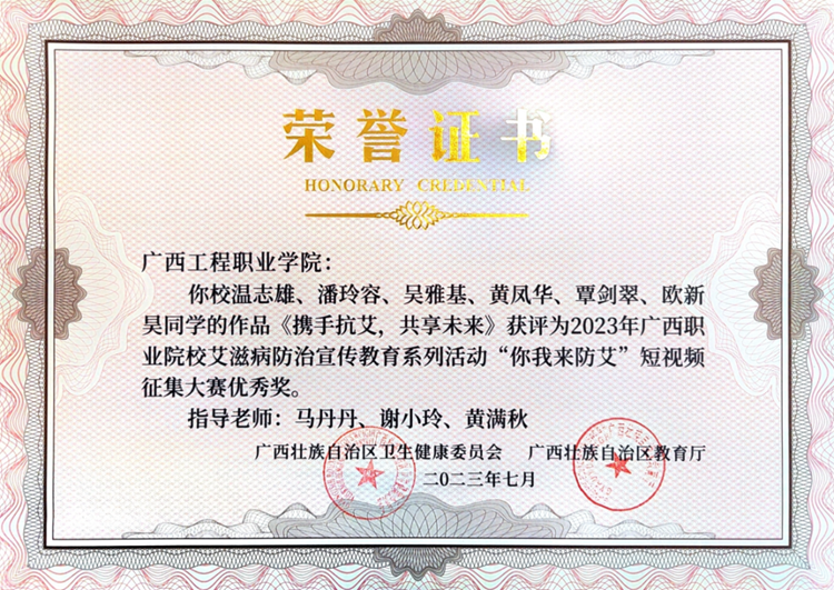 溫志雄、潘玲容、吳雅基、黃鳳華、覃劍翠、歐新昊同學(xué)的作品《攜手抗艾,共享未來(lái)》榮獲優(yōu)秀獎(jiǎng)
