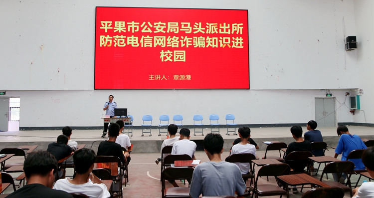 平果市城東派出所所長覃源港做防范電信網(wǎng)絡(luò)詐騙知識專題講座