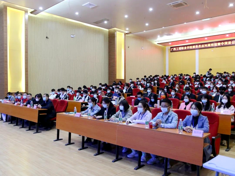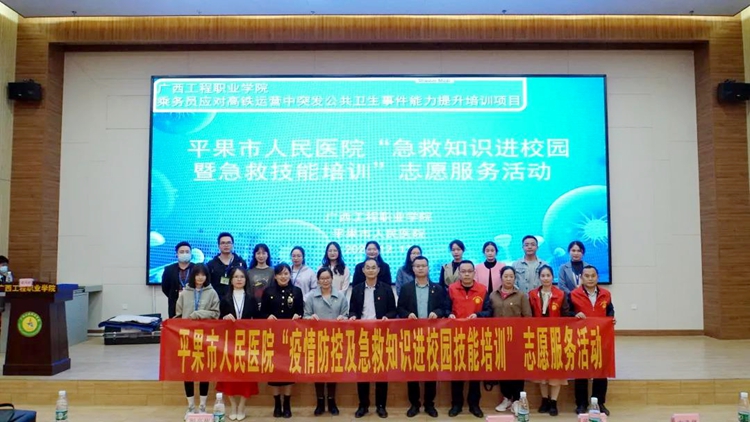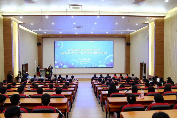 為進(jìn)一步提升學(xué)生應(yīng)對突發(fā)公共衛(wèi)生事件的能力,鞏固專業(yè)知識,有效預(yù)防、及時控制和消除突發(fā)公共衛(wèi)生事件的危害,保障乘客身體健康與生命安全,維護(hù)正常的社會秩序。我校鐵道與航空學(xué)院聯(lián)合平果市人民醫(yī)院于12月17日下午在校圖文信息大樓三樓學(xué)術(shù)報告廳開展乘務(wù)員應(yīng)對高鐵運營中突發(fā)公共衛(wèi)生事件能力提升培訓(xùn)活動暨平果市人民醫(yī)院“急救知識進(jìn)校園”、“急救技能培訓(xùn)”志愿服務(wù)活動 。