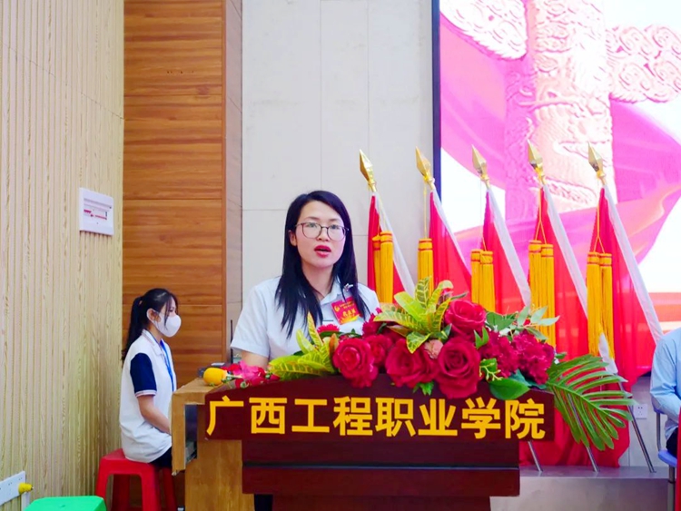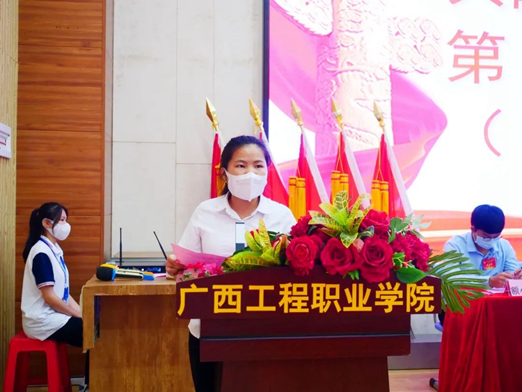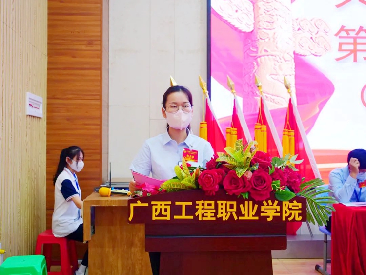 教育學(xué)院分團(tuán)委書記盧燕梅宣讀《關(guān)于中國共產(chǎn)主義青年團(tuán)廣西工程職業(yè)學(xué)院第五次代表大會工作報告的決議》(草案)