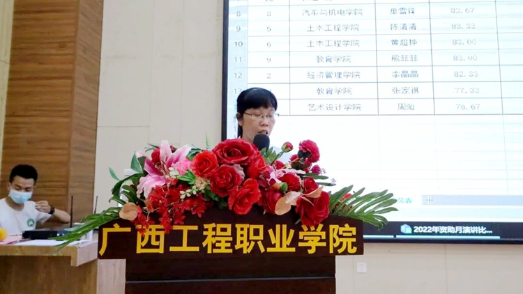 比賽結(jié)束后,黃秋霞副書記對(duì)比賽進(jìn)行點(diǎn)評(píng)總結(jié)。她對(duì)本次比賽給予充分肯定,并就選手的演講內(nèi)容、表達(dá)技巧、精神面貌等方面進(jìn)行點(diǎn)評(píng),提出了建議和意見(jiàn)。同時(shí),號(hào)召同學(xué)們要牢記習(xí)近平總書記的囑托,做理想遠(yuǎn)大、信念堅(jiān)定的模范,做刻苦學(xué)習(xí)、銳意創(chuàng)新的模范,做敢于斗爭(zhēng)、善于斗爭(zhēng)的模范,做艱苦奮斗、無(wú)私奉獻(xiàn)的模范,做崇德向善、嚴(yán)守紀(jì)律的模范。為實(shí)現(xiàn)個(gè)人的青春夢(mèng)、學(xué)校“升本夢(mèng)”和中華民族偉大復(fù)興的中國(guó)夢(mèng)砥礪前行,努力奮斗!用實(shí)際行動(dòng)追夢(mèng)鑄夢(mèng),不負(fù)黨和人民的殷切期望,以實(shí)際行動(dòng)回報(bào)父母、回報(bào)學(xué)校、回報(bào)社會(huì)、回報(bào)國(guó)家。