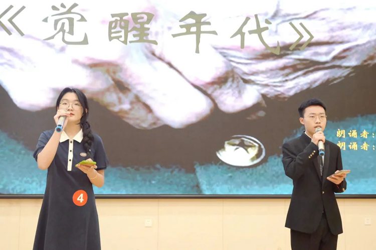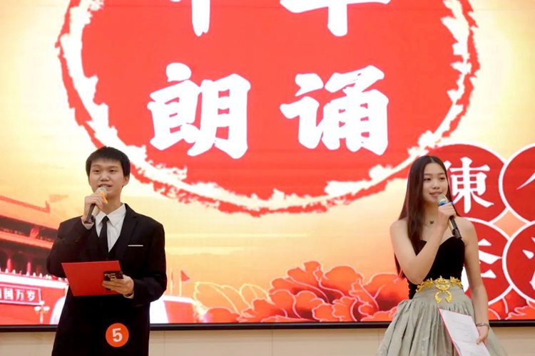 全體起立奏唱國(guó)歌。校園之聲廣播站帶來(lái)的精彩配音節(jié)目《建國(guó)大業(yè)》拉開了比賽的序幕。