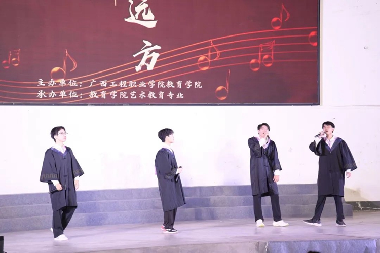 青春盛世,巍巍學(xué)府藏不住奕奕風(fēng)采,奮斗正當(dāng)時(shí)。歲月流逝,飛馳的時(shí)光帶不走永恒的夢(mèng)想,逐夢(mèng)在路上。時(shí)光荏苒,流逝的歲月?lián)]不去執(zhí)著的信念,圓志在指尖腳下。2023年6月12日晚,廣西工程職業(yè)學(xué)院教育學(xué)院在體育館舉行2021級(jí)藝術(shù)教育專業(yè)(音樂方向)“再見•在遠(yuǎn)方”專業(yè)匯報(bào)演出。