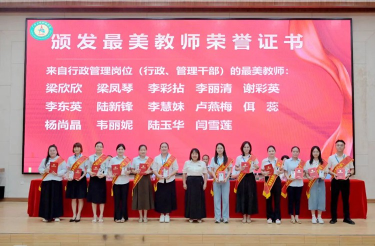 校長(zhǎng)羅艷妮為獲得“最美教師”榮譽(yù)稱號(hào)的行政管理崗位教師頒獎(jiǎng)