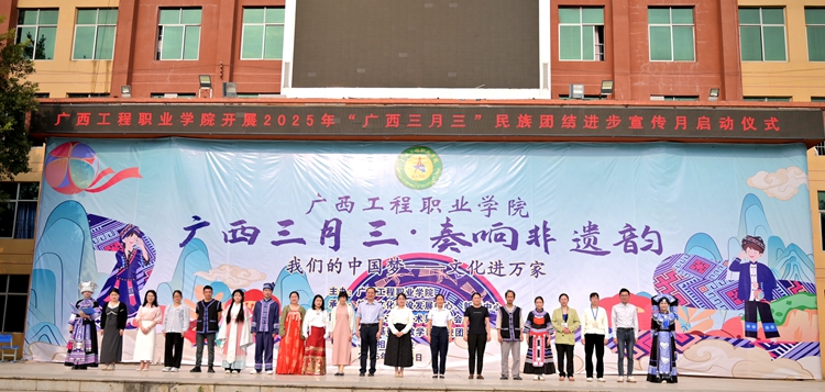 2025年3月25日,廣西工程職業(yè)學(xué)院2025年“廣西三月三”非遺文化進(jìn)校園暨“廣西三月三”民族團(tuán)結(jié)進(jìn)步宣傳月啟動(dòng)儀式在魯班廣場(chǎng)舉行,平果市文學(xué)藝術(shù)界聯(lián)合會(huì)副主席農(nóng)春艷,黨委委員、組織部部長(zhǎng)、副校長(zhǎng)蔣茂麗,副校長(zhǎng)黃德偉,校長(zhǎng)助理梁善雅及黨委辦公室、黨委宣傳部、統(tǒng)戰(zhàn)部、教師工作部、學(xué)生工作處、校團(tuán)委等相關(guān)部門(mén)負(fù)責(zé)人出席啟動(dòng)儀式。各二級(jí)學(xué)院師生代表參加儀式。