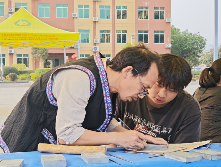 國(guó)家非遺“端硯制作技藝”傳承人、廣西工藝美術(shù)大師、廣西工匠農(nóng)逵為師生傳授雕刻技藝