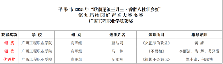 為進(jìn)一步傳承和弘揚(yáng)中華優(yōu)秀傳統(tǒng)文化,深化民族團(tuán)結(jié)進(jìn)步教育,活躍校園文化氛圍,持續(xù)推動(dòng)師生鑄牢中華民族共同體意識(shí),3月26日,廣西工程職業(yè)學(xué)院組織學(xué)子參加平果市2025年“歌潮逐浪三月三•香醉八桂壯鄉(xiāng)紅”第九屆校園好聲音大賽決賽,并榮獲兩銀一優(yōu)秀獎(jiǎng)的喜人成績(jī)。