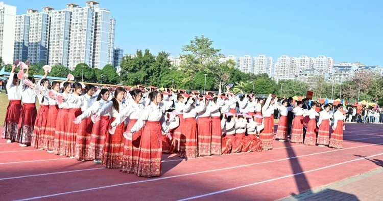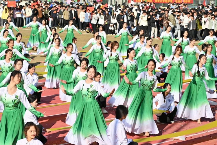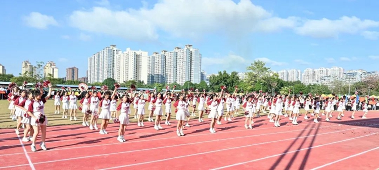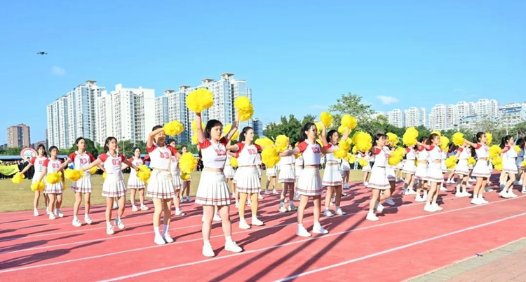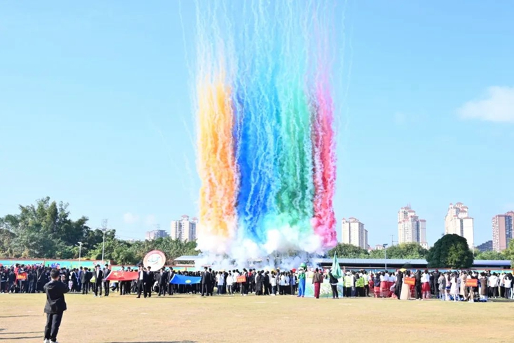 禮炮隨即齊響,繽紛的禮花漫天飛揚(yáng),現(xiàn)場掌聲不斷,運(yùn)動會正式拉開序幕,下面是文藝表演。