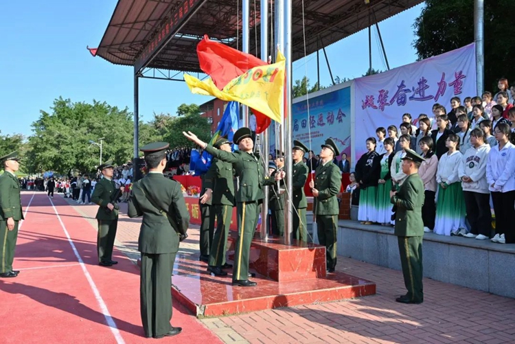 師生們面向國旗行注目禮,鮮艷的五星紅旗冉冉升起,點(diǎn)燃了運(yùn)動健兒們的朝氣與熱情。