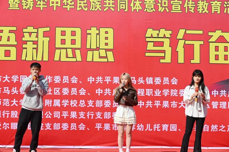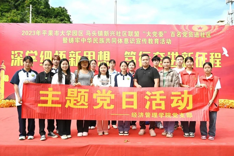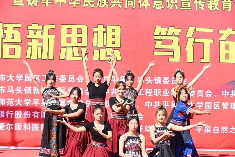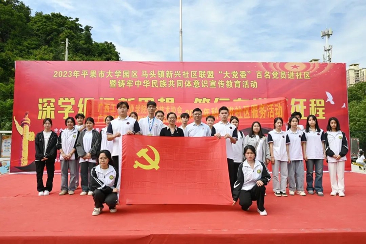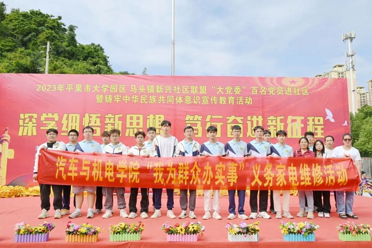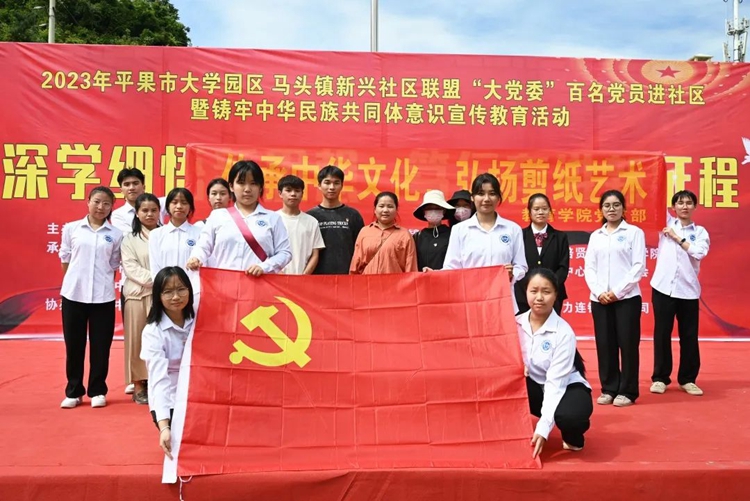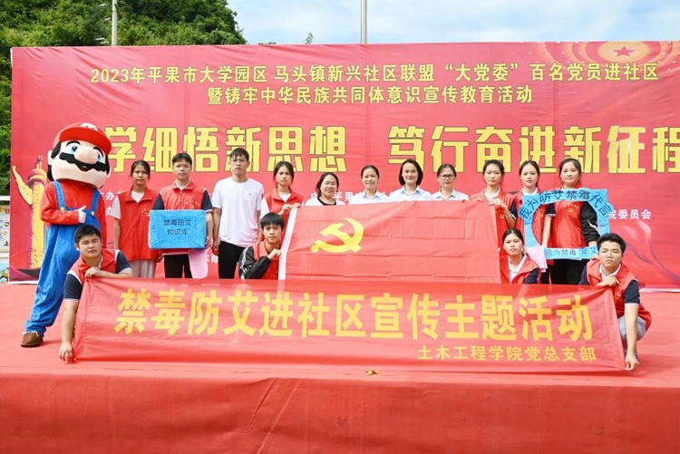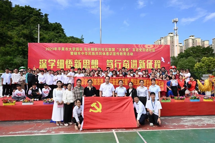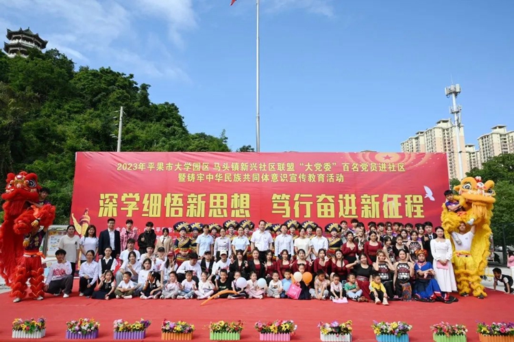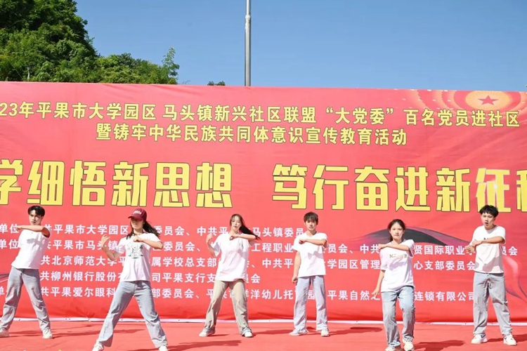 為學(xué)思踐悟新思想,以昂揚飽滿的熱忱奮進新征程,推進校社聯(lián)盟“大黨委”活動聯(lián)辦常態(tài)化,扎實開展“我為群眾辦實事”實踐活動,全面推進民族團結(jié)進步事業(yè)的全面發(fā)展,進一步豐富社區(qū)居民的精神文化生活,2023年10月21日,學(xué)校黨委組織100多名師生黨員志愿者參加平果市大學(xué)園區(qū)與馬頭鎮(zhèn)新興社區(qū)聯(lián)盟“大黨委”開展的“深學(xué)細悟新思想 篤行奮進新征程”暨民族團結(jié)進步創(chuàng)建活動,到馬頭鎮(zhèn)新興社區(qū)開展送文藝進社區(qū)、送服務(wù)進社區(qū)等民族團結(jié)進步創(chuàng)建系列活動。