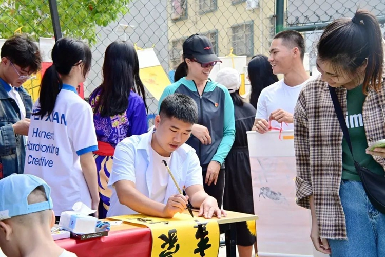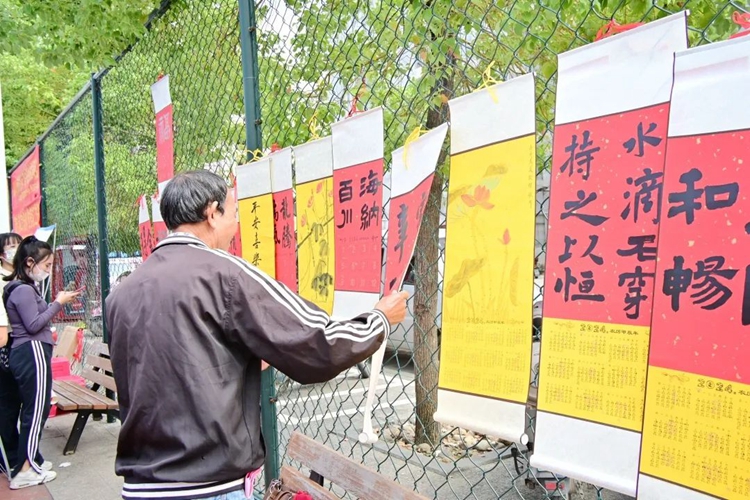 活動現(xiàn)場設(shè)置了互動區(qū),提供了書法、繪畫等互動活動,居民們也可以參與到掛歷的書畫創(chuàng)作活動中。整個活動現(xiàn)場氛圍熱烈、溫馨,志愿者們與社區(qū)居民們?nèi)谇⒒?,共同展示了他們的?chuàng)意和文化素養(yǎng),進一步增進了校園與社區(qū)的聯(lián)系,推動民族團結(jié)進步。