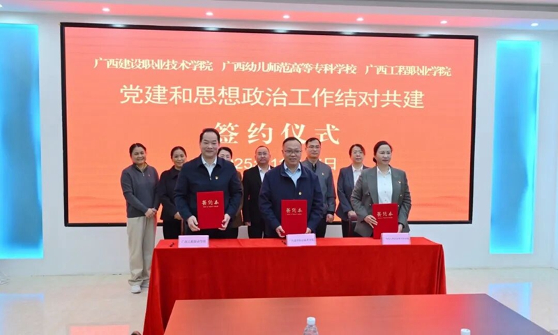 11月27日,廣西工程職業(yè)學(xué)院與廣西建設(shè)職業(yè)技術(shù)學(xué)院、廣西幼兒師范高等??茖W(xué)校黨建和思想政治工作結(jié)對共建簽約儀式在我校圖書館大數(shù)據(jù)中心舉行。廣西幼兒師范高等??茖W(xué)校黨委副書記、紀(jì)委書記龐娟娟,廣西建設(shè)職業(yè)技術(shù)學(xué)院副校長付春松,我校黨委書記、政府督導(dǎo)專員蒙本曼,黨委副書記黃秋霞,紀(jì)委書記、副校長彭高彬,副校長蔣茂麗、梁善雅等三校校級領(lǐng)導(dǎo)出席儀式;戴世琴、蒙文艷、謝儉、張筠、李達(dá)鐸、毛娟翠等六名結(jié)對共建工作隊隊員,以及我校各部門負(fù)責(zé)人參加儀式。