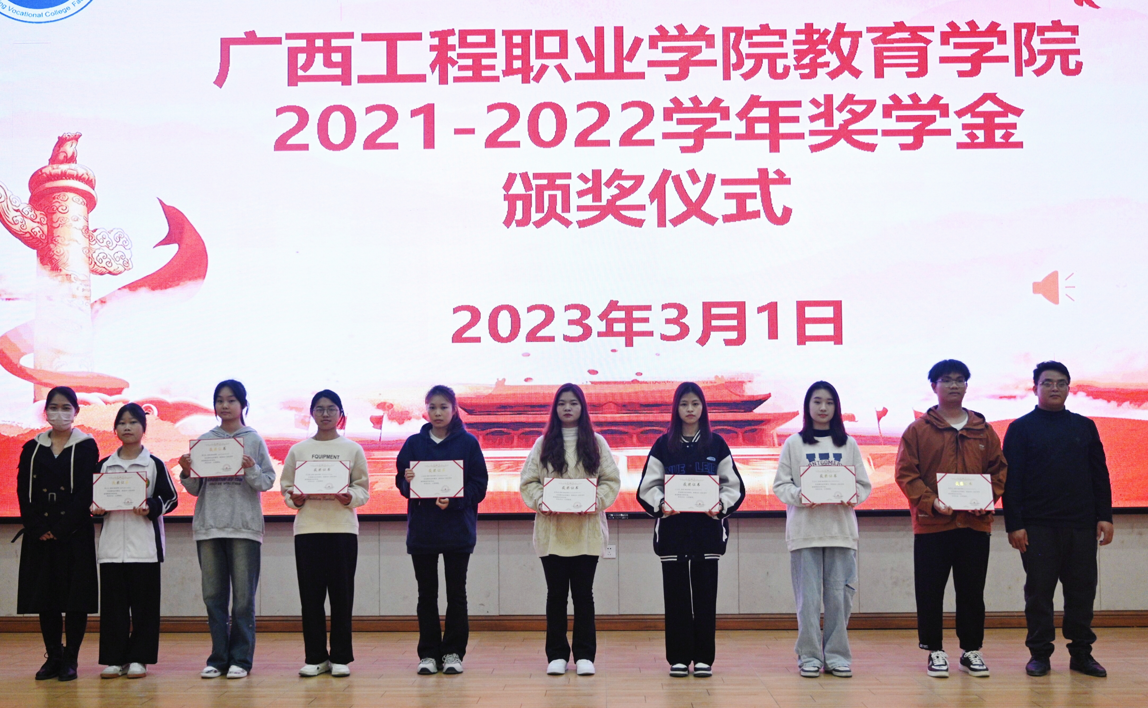 歲月荏苒,匆匆而逝。在校園那美麗的花朵即將綻放的日子,我們又相聚在一起。2023年3月1日晚,廣西工程職業(yè)學(xué)院教育學(xué)院在圖文信息一樓學(xué)術(shù)報告廳舉行了“2021-2022學(xué)年度獎學(xué)金頒獎儀式”。