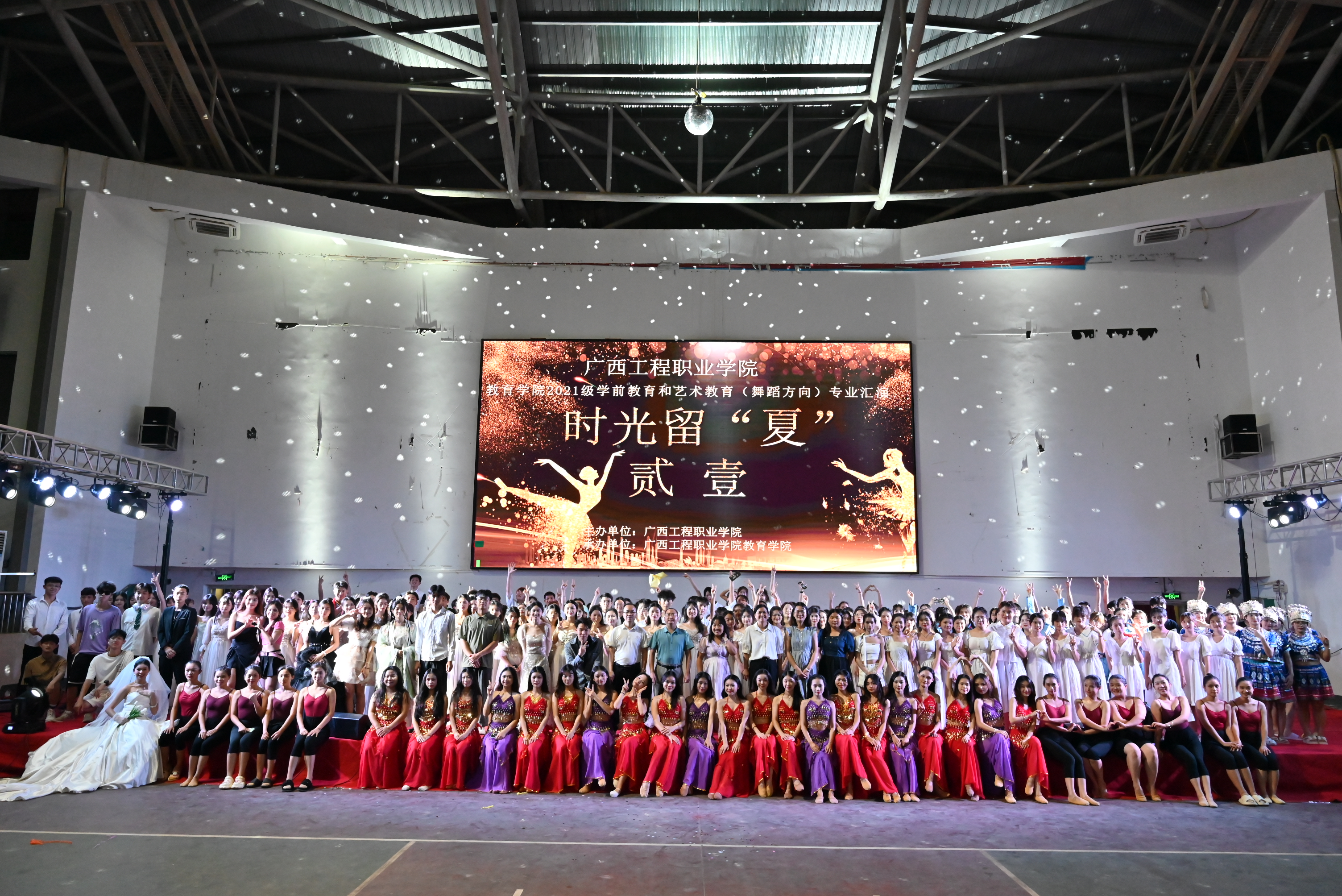 夕陽已落,彎月如鉤,盛夏炎炎送來流光的季節(jié);繁花如織,燈火似夢,星光點點簇擁浩大的會場。2023年6月20日,廣西工程職業(yè)學院教育學院在學校體育館舉行2021級學前教育和藝術教育(舞蹈方向)專業(yè)匯演。學校校長羅艷妮,學校紀委書記、副校長彭高彬,副校長吳先夏,校長助理梁善雅,學校黨委委員、學生工作處副處長李麗詩,秘書處處長楊雨晴,教育學院黨支部書記、院長梁鳳琴,國防科技學院辦公室主任黃秀妮等等師生觀看了本場晚會。