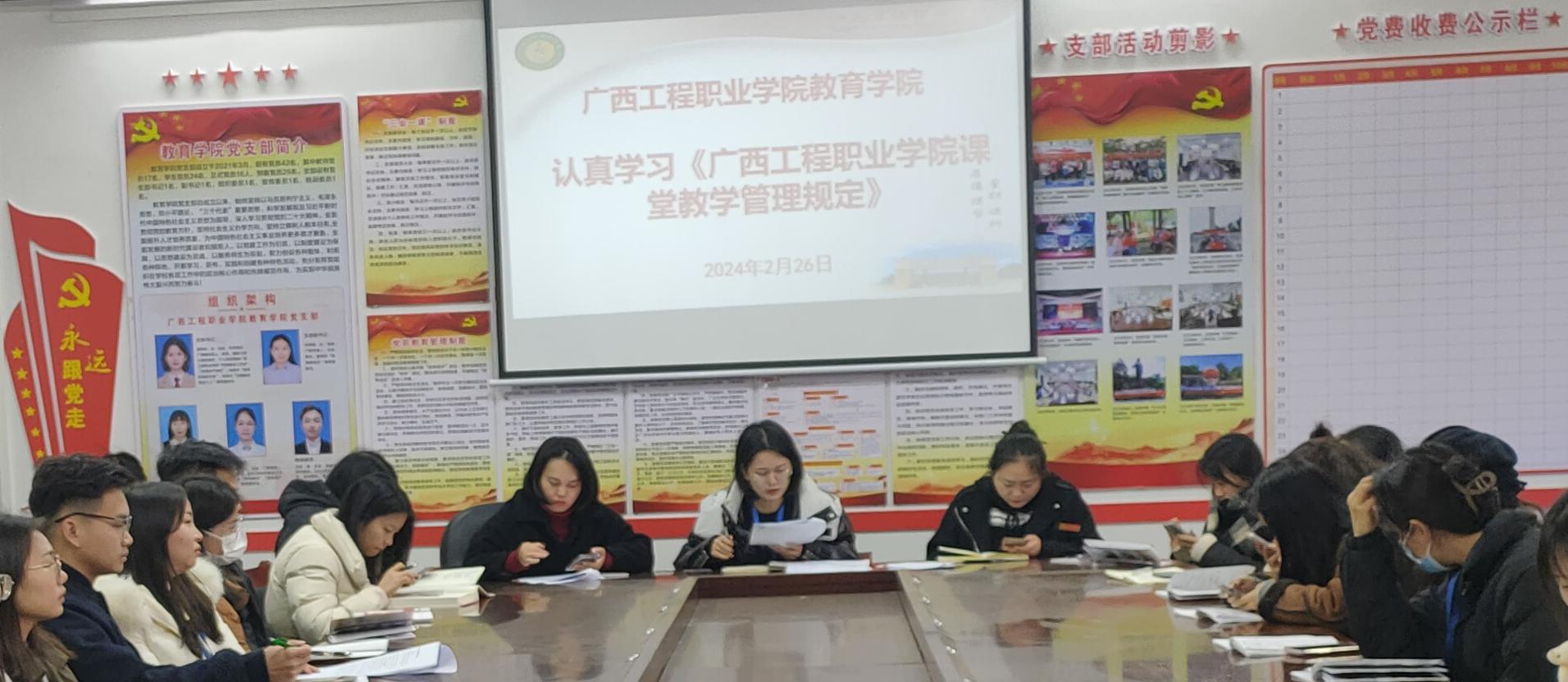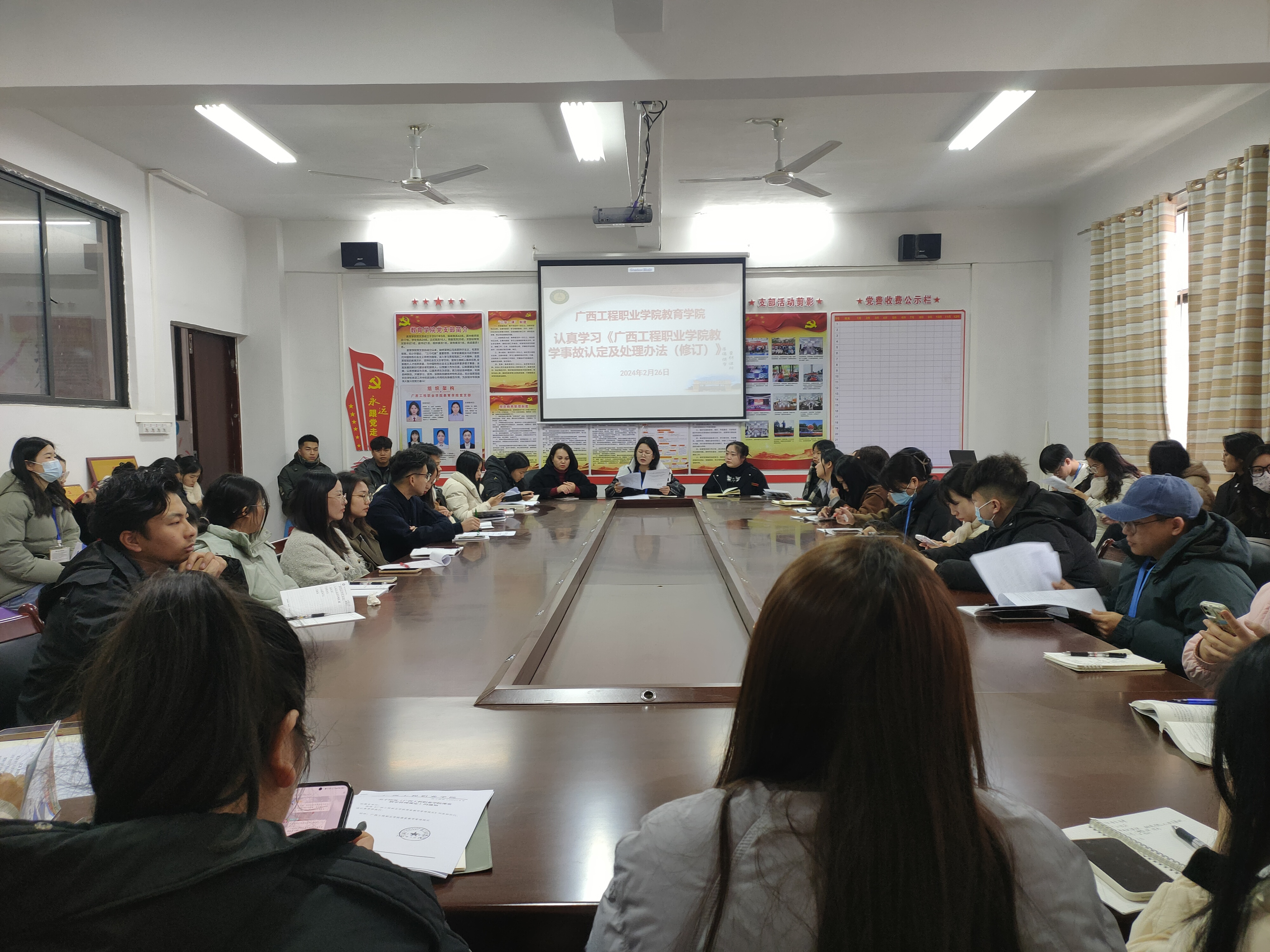 梁鳳琴院長(zhǎng)就上學(xué)期期末階段工作完成情況進(jìn)行總結(jié)傳達(dá),并圍繞新學(xué)期教學(xué)、科研、管理等各項(xiàng)工作作出安排部署。在會(huì)議上學(xué)習(xí)了《廣西工程職業(yè)學(xué)院課堂教學(xué)管理規(guī)定》與《廣西工程職業(yè)學(xué)院教學(xué)事故認(rèn)定及處理辦法(修訂)》,一是為進(jìn)一步加強(qiáng)課堂教學(xué)管理,維護(hù)良好的教學(xué)秩序,樹(shù)立嚴(yán)謹(jǐn)?shù)男oL(fēng)、教風(fēng)和學(xué)風(fēng),保證課堂教學(xué)效果,提高教學(xué)質(zhì)量。二是為進(jìn)一步加強(qiáng)教學(xué)管理,嚴(yán)格教學(xué)紀(jì)律,規(guī)范教學(xué)行為,維持正常的教學(xué)秩序,創(chuàng)造良好的教學(xué)環(huán)境,提高教育教學(xué)質(zhì)量。