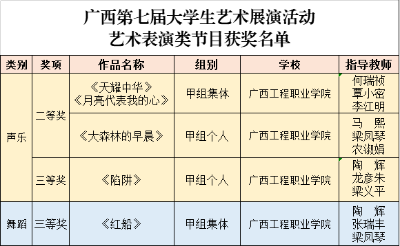 近日,根據(jù)廣西壯族自治區(qū)教育廳下發(fā)的《自治區(qū)教育廳關(guān)于公布廣西第七屆大學(xué)生藝術(shù)展演活動獲獎名單的通知》(桂教體衛(wèi)藝〔2024〕6號)文件,我院教師參與指導(dǎo)的作品在廣西第七屆大學(xué)生藝術(shù)展活動表現(xiàn)出色,榮獲二等獎2項(xiàng),三等獎2項(xiàng)。