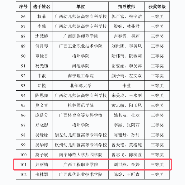 本次大賽匯聚了全區(qū)多所高校的優(yōu)秀學(xué)子,競爭異常激烈。比賽涵蓋教學(xué)設(shè)計、說課、模擬授課等多個環(huán)節(jié),全面考察了參賽選手的教學(xué)綜合素養(yǎng)。我院學(xué)生在比賽中充分展現(xiàn)了扎實的專業(yè)功底和創(chuàng)新的教學(xué)理念,贏得了評委的高度認可。其中,我院歸麗婧同學(xué)榮獲學(xué)前教育組三等獎。