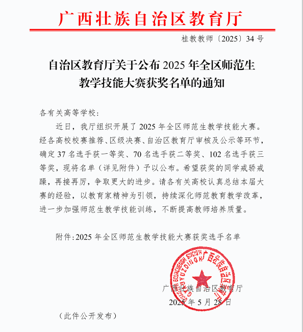 近日,2025 年廣西壯族自治區(qū)師范生教學(xué)技能大賽圓滿落幕。我院共派出三名學(xué)子, 分別是李婷、劉世燕老師指導(dǎo)的2023級學(xué)前教育9班學(xué)生歸麗婧;覃小密、何瑞禎老師指導(dǎo)的2023級藝術(shù)教育4班梁思媛;梁善雅、李婷慧老師指導(dǎo)的2023級藝術(shù)教育5班韋煙霞。?